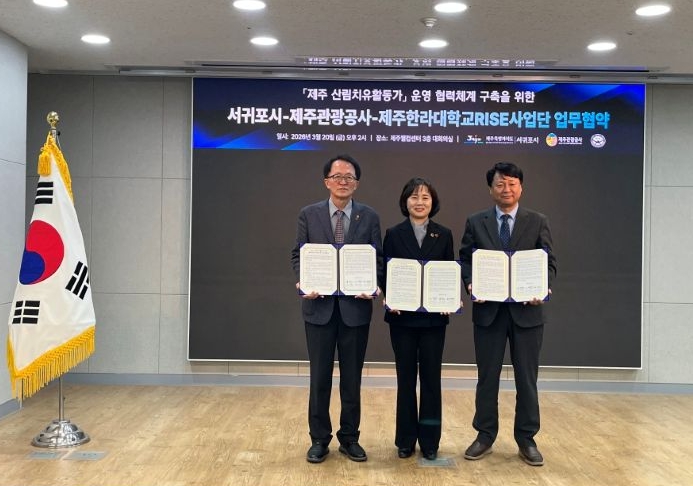 [뉴스노크=김인호 기자] 서귀포시는 20일 제주관광공사, 제주한라대학교 RISE사업단과 함께 ‘제주 산림치유활동가 운영 협력체계 구축을 위한 업무협약’을 체결했다고 밝혔다.