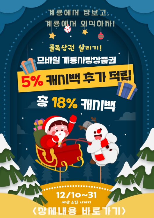 [뉴스노크=김인호 기자] 계룡시는 연말을 맞아 지역 소비 촉진과 골목상권 활성화를 위해 10일부터 31일까지(예산 소진 시 조기 종료) 골목상권 가맹점에서 모바일 계룡사랑상품권으로 결제하면 기존 13% 캐시백에 5%를 추가하여 최대 18% 적립 혜택을 제공한다고 밝혔다.