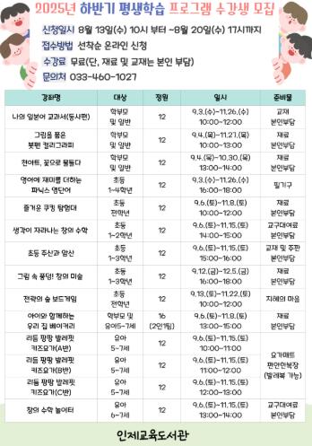 자세한 일정과 내용은 인제교육도서관 누리집을 참고하거나 전화로 문의하면 된다.