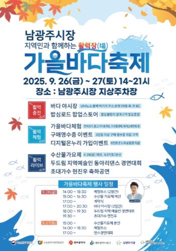 [뉴스노크=김인호 기자] 광주 동구는 오는 26~27일 이틀간 남광주시장 공영주차장 일원에서 ‘활력장! 가을 바다 축제’를 개최한다고 밝혔다.