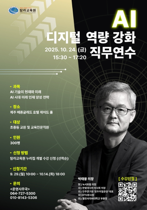 탐라교육원 관계자는 “이번 명사특강은 인공지능 시대에 교육의 본질을 새롭게 해석하고 교사의 역할을 재정의하는 시간이 될 것”이라며 “학교 현장의 변화를 이끄는 교사들의 전문성과 미래 역량을 강화하는 데 기여할 것으로 기대한다”라고 말했다.