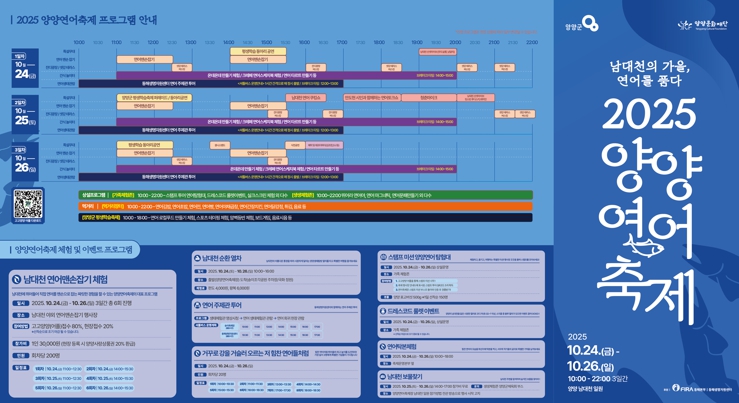 양양군과 (재)양양문화재단이 공동 주최·주관하는 이번 축제는 ‘남대천의 가을, 연어를 품다’를 주제로 연어의 회귀 본능을 상징적으로 표현하며, 생태·체험·문화가 어우러진 복합형 지역축제로 진행된다.