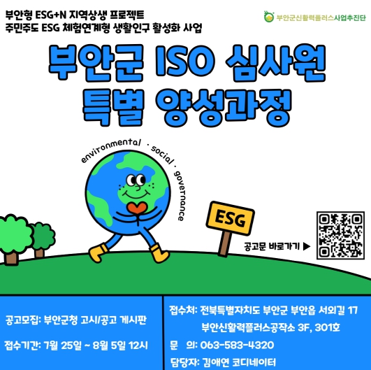 [뉴스노크=김인호 기자] 부안군 신활력플러스사업추진단은 2025년 8월 9일부터 31일까지 매주 주말 총 4개 과정의 ‘ISO 국제공인심사원 특별 양성과정’을 부안읍 소재 ‘신활력공작소(서외길 17)’ 운영하며, 교육 참가자를 오는 8월 5일 낮 12시까지 모집한다고 밝혔다. 이번 교육은 부안형 ESG+N 지역상생 프로젝트의 일환으로 추진되며, 주민주도의 ESG 실천 기반을 강화하고 지역 기반의 ESG 전문 인력을 육성하기 위해 마련됐다.