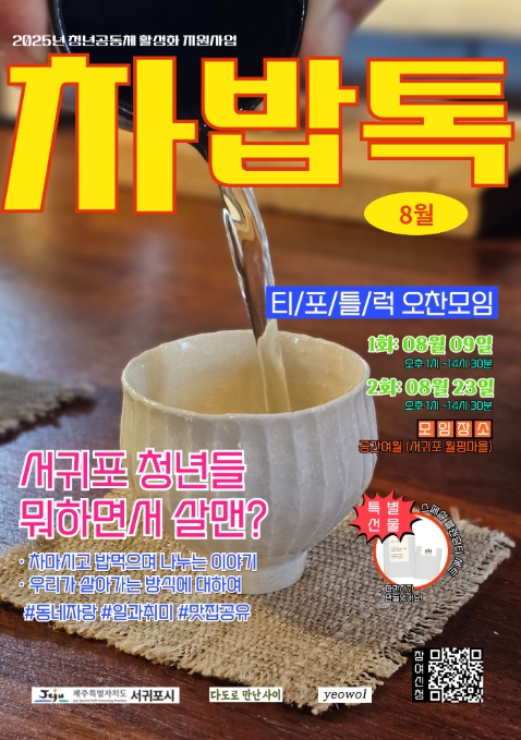[뉴스노크=김인호 기자] 서귀포시는 2025년 청년 공동체 활성화 사업의 일환으로 추진되는 청년 커뮤니티‘다도로 만난 사이’(다만사)가 ‘서귀포시 청년 차밥톡’ 참여자를 8월 6일까지 모집한다고 밝혔다.