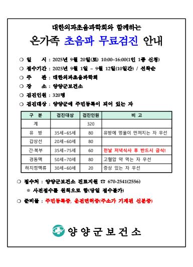 [뉴스노크=김인호 기자] 양양군이 지난 2024년에 이어 2회째로 대한외과초음파학회 소속 의사를 초청하여 군민들에 초음파 무료 검진을 올해도 지원한다.