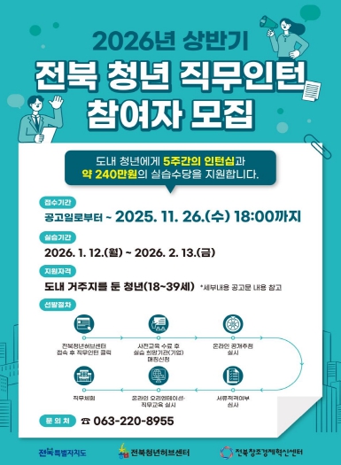 [뉴스노크=김인호 기자] 전북특별자치도와 전북창조경제혁신센터가 ‘2026년 상반기 전북 청년 직무인턴’ 참여자를 11월 26일까지 모집한다.