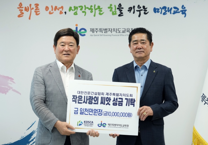 [뉴스노크=김인호 기자] 대한전문건설협회 제주특별자치도회는 14일 ‘작은 사랑의 씨앗’ 성금으로 제주특별자치도교육청에 1000만원을 기탁했다.