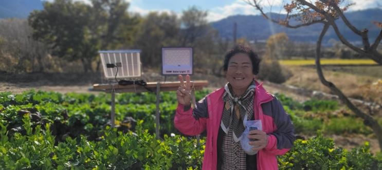 | ▲ 설치된 태양광 외등 앞에서 사진을 찍은 지원 가구 |