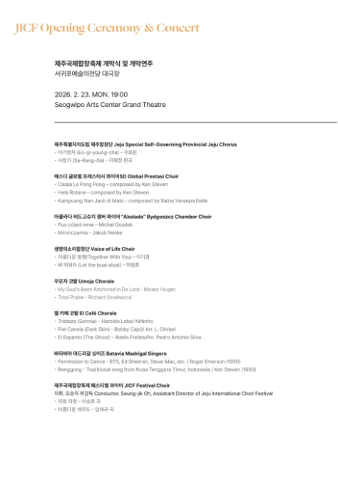 한편, ‘제10회 제주국제합창축제’는 ‘사랑의 합창으로 하나가 되자!’를 주제로 개최되며, 국내외 합창단 공연과 마스터클래스 등 다채로운 프로그램이 진행된다.