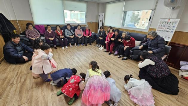 이날 원아들은 서툰 자세로 세배를 올리며 어르신들께 건강과 안녕을 기원했다. 어르신들은 환한 미소로 덕담을 건네며 화답했다. 경로당에서는 풍경 만들기와 전통 팽이치기 체험이 진행돼 아이들과 어르신이 함께 참여했다.