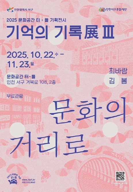 [뉴스노크=김인호 기자] 인천서구문화재단은 10월 22일부터 11월 23일까지 문화공간 터·틀(석남)에서 기획전시 기억의 기록展 세 번째 시리즈 ‘문화의 거리로’를 개최한다.