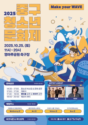인천시 중구는 오는 25일 영마루공원(영종대로 77) 축구장 일대에서 ‘2025 중구청소년문화제’을 개최한다.
