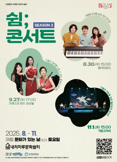 [뉴스노크=김인호 기자] (재)인천중구문화재단(이사장 김정헌)은 올 하반기 내리마루 문화쉼터에서 ‘쉼; 콘서트 시즌2’와 ‘그림책 문학 쉼터’ 등 다채로운 지역문화 활성화 프로그램을 선보인다고 12일 밝혔다.
