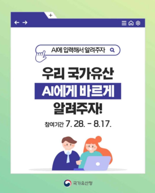 [뉴스노크=김인호 기자] 국가유산청은 7월 28일부터 8월 17일까지 3주에 걸쳐 중·고등학생 및 대학생을 대상으로 생성형 인공 지능(AI)에 노출된 국가유산 관련 오류를 찾아 시정하고 정확한 내용으로 학습시키는 '국가유산 AI 학습 챌린지 캠페인'을 진행한다.