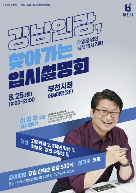 이번 설명회는 부천시가 지난 2월 강남구청과 ‘인터넷 수능방송(강남인강)’ 공동 이용 협약을 체결한 이후 추진하는 교육 협력 사업의 하나로, 설명회 당일 선착순 530명까지 무료로 입장할 수 있다.