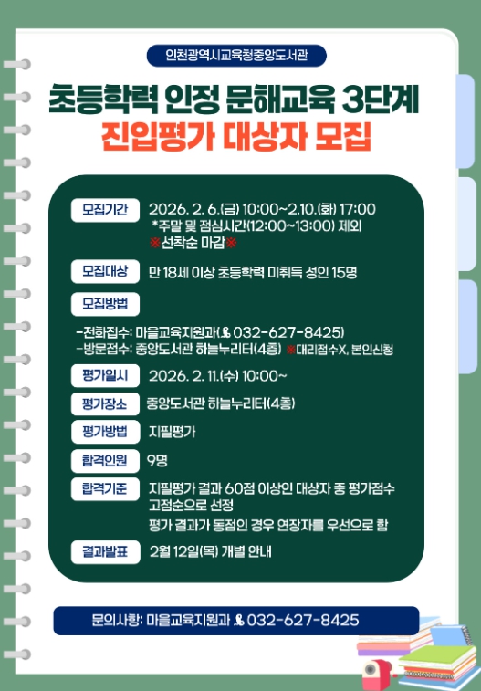 [뉴스노크=김인호 기자] 인천광역시교육청중앙도서관은 초등 학력을 취득하지 못한 성인의 학력 취득 기회 제공을 위하여, ‘2026년 초등학력 인정 문해교육 3단계 진입평가’ 대상자를 모집한다.