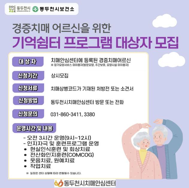 | ▲ 동두천시치매안심센터, 치매 환자 위한 ‘기억쉼터’ 참여자 모집 |