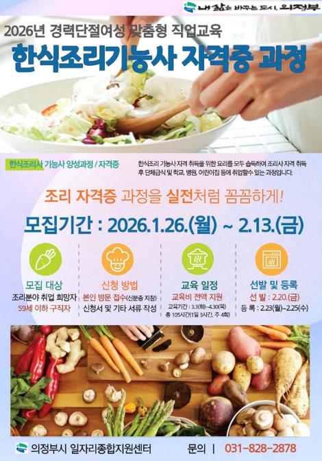 [뉴스노크=김인호 기자] 의정부시는 경력단절여성의 안정적인 재취업을 지원하기 위해 ‘2026년 한식조리기능사 자격증 과정’ 참여자를 모집한다.