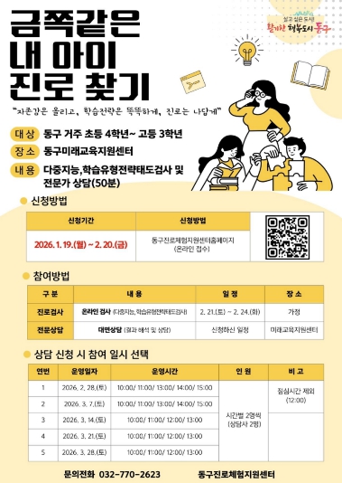 [뉴스노크=김인호 기자] 인천 동구는 관내 청소년들이 자기주도적으로 진로를 설계할 수 있도록 돕는‘2026년 금쪽같은 내 아이 진로 찾기’프로그램 운영참여자를 모집한다고 밝혔다.
