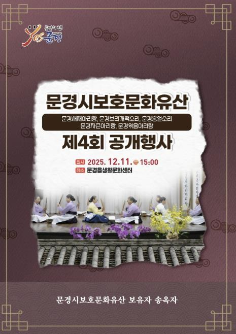 이번 공개행사는 문경시 보호문화유산으로 지정된 송옥자 보유자가 그 동안 갈고닦은 기량을 선보이는 뜻깊은 자리로 2022년 첫 시작 이후 올해로 네 번째를 맞이하며, 무형유산 전승의 중요성을 널리 알리고, 시민들이 문경새재아리랑의 전통 문화를 더욱 깊이 이해하며 함께 즐길 수 있는 따뜻한 문화 교류의 장이 될 것으로 기대된다.