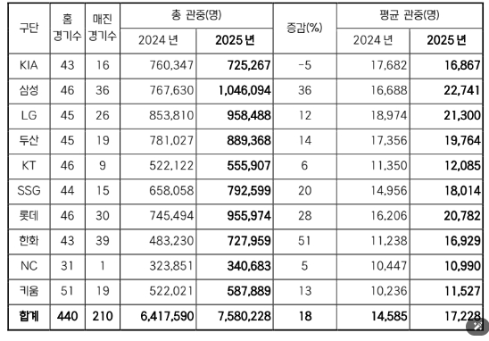 ▲ 2025년 구단별 관중 현황(2024-2025 홈 경기수 비교) |