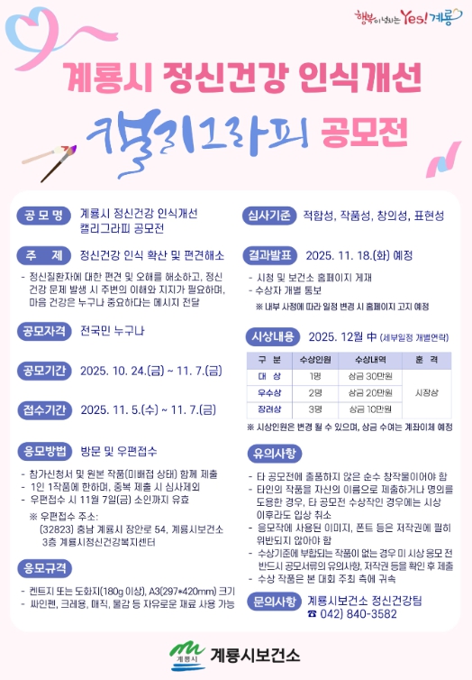 [뉴스노크=김인호 기자] 계룡시는 정신건강 홍보주간(10. 10.∼24.)을 맞아 시민이 직접 참여하는 ‘계룡시 정신건강 인식개선 캘리그라피 공모전’을 개최한다.