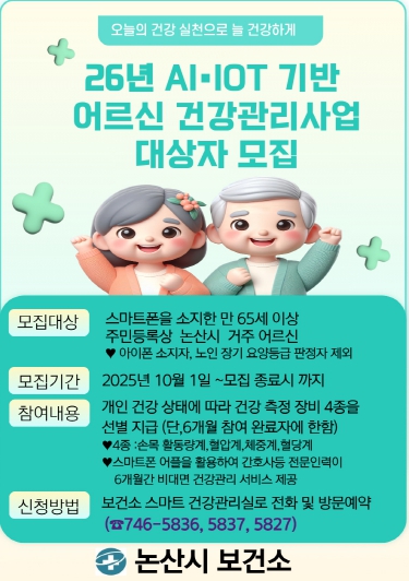 [뉴스노크=김인호 기자] 논산시는 오는 10월 1일부터 선착순으로 2026년 AI-IoT(인공지능·사물인터넷) 기반 어르신 건강관리사업 참여자를 모집한다.