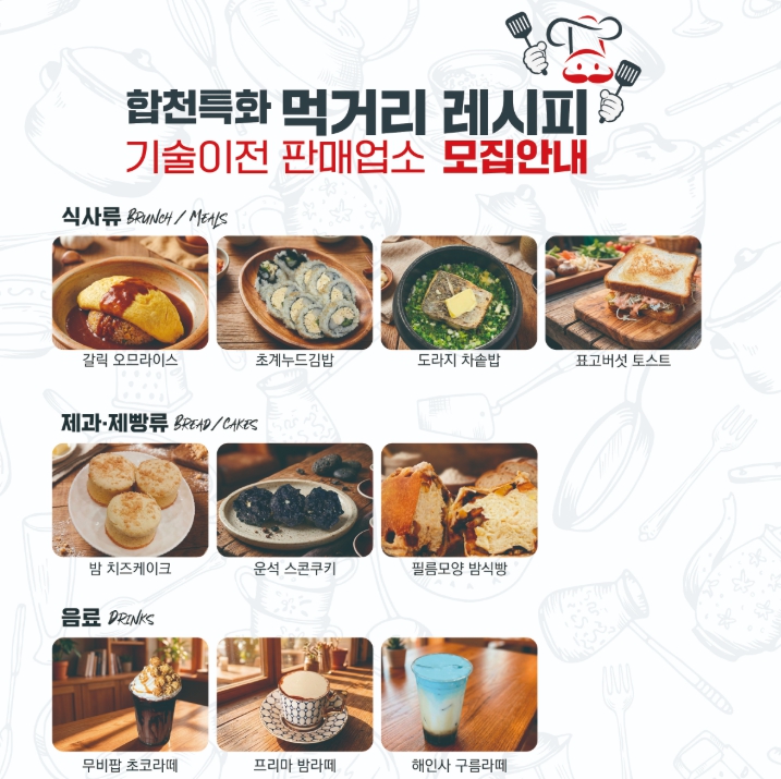 모집 대상은 합천군 내에 영업 신고가 된 일반음식점, 제과점, 휴게음식점 등이며, 기술이전을 통해 창업을 준비 중인 예비 창업자도 신청 가능하다.