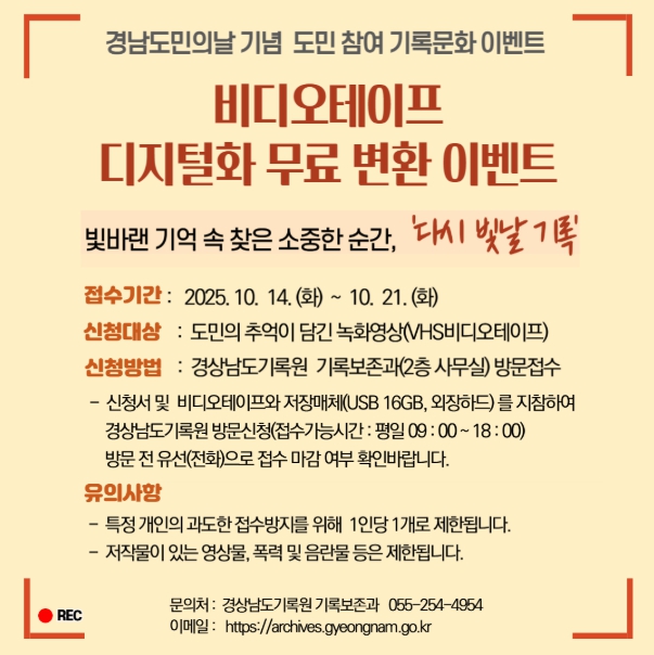 [뉴스노크=김인호 기자] 경상남도기록원은 10월 14일부터 31일까지 도민이 소중한 추억을 오래도록 보존할 수 있도록 '빛바랜 기록 속 찾은 소중한 순간 – 다시 빛날 기록'이라는 주제로 비디오테이프 디지털 변환 이벤트를 추진한다고 밝혔다.