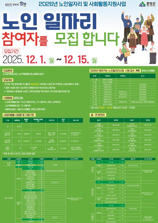 신청은 12월 1일부터 15일까지 11개 읍면, 4개 수행기관에서 방문 접수를 진행하며, 함양시니어클럽에서는 각 읍면 찾아가는 신청접수도 진행한다.