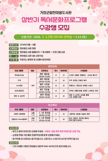 [뉴스노크=김인호 기자] 거창군 한마음도서관은 오는 3월 5일부터 군민들의 지적 욕구를 충족시키고 문화적 소양을 높이기 위한 ‘상반기 독서문화 프로그램’ 수강생을 모집한다.
