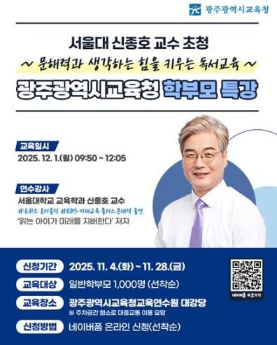 [뉴스노크=김인호 기자] 광주시교육청이 오는 12월 1일 오전 9시 40분 광주시교육청교육연수원 대강당에서 서울대학교 교육학과 신종호 교수 초청 학부모 특강을 진행한다.