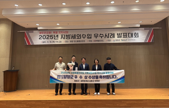 [뉴스노크=김인호 기자] 양양군은 지난 9월 19일 강원도 평창 모나 용평리조트에서 열린 ‘2025 지방세외수입 우수사례 발표대회’에서 신규수입원발굴 부문 우수상을 수상했다.