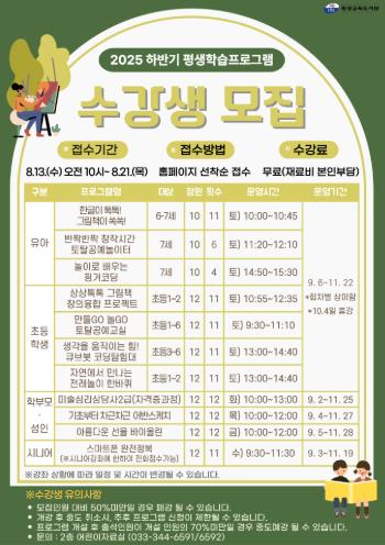 [뉴스노크=김인호 기자] 횡성교육도서관은 9월 2일부터 11월 28일까지 지역 학생과 주민에게 다양한 문화예술 활동의 기회를 제공하고자 ‘2025년 하반기 평생학습 강좌’를 운영한다.