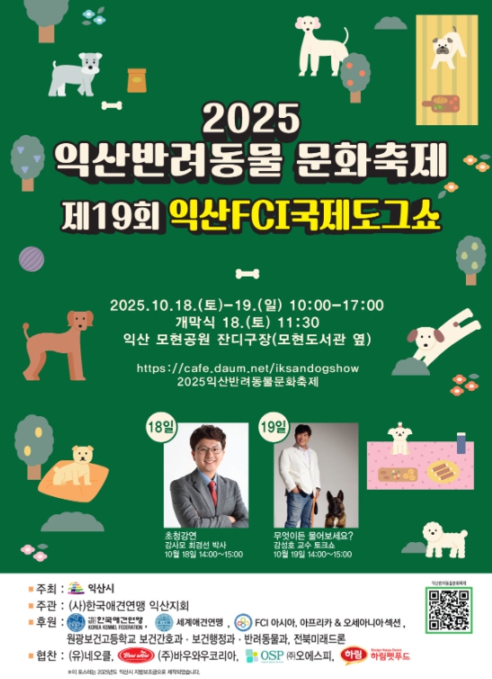 익산시는 오는 18~19일 모현공원 잔디구장에서 '2025 익산 반려동물 문화축제 및 제19회 익산 FCI 국제 도그쇼'를 개최한다고 13일 밝혔다.