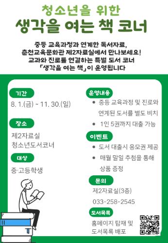 ‘생각을 여는 책’ 코너는 중등 교육과정 및 진로와 연계된 자기주도적 독서 활동을 지원하기 위한 프로그램으로, 춘천교육문화관이 보유한 도서 중 교과 및 진로 탐색에 활용 가능한 도서를 선정하여 제2자료실 청소년 도서 코너에 별도로 비치하여 제공한다.