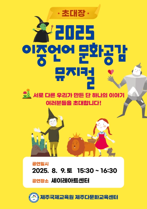 [뉴스노크=김인호 기자] 제주도교육청 제주국제교육원은 내달 7일부터 9일까지 2박 3일 일정으로 제주다문화교육센터에서 도내 초등학교 6학년부터 중학교 3학년 학생 20명을 대상으로‘2025 이중언어 문화공감 뮤지컬 캠프’를 운영한다.