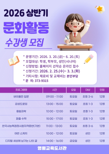 [뉴스노크=김인호 기자] 영월교육도서관은 3월 20일부터 6월 20일까지, 2026년 상반기 문화활동 강좌를 운영한다.
