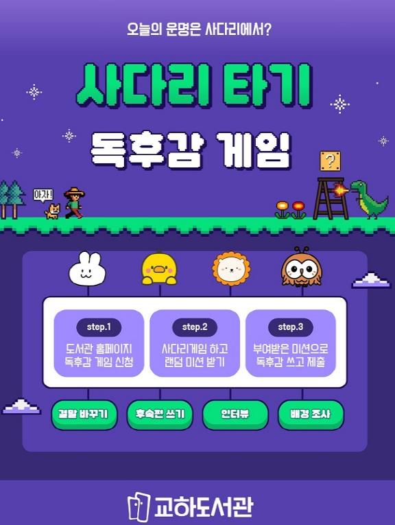 이번 프로그램은 기존의 줄거리·느낌 쓰기의 독후감에서 벗어나, 온라인 사다리 타기 등 게임을 통해 ‘결말 바꾸기’, ‘후속편 이어 쓰기’ 등 무작위 과제(미션) 수행을 통해 다양한 방식으로 독후감을 작성해 보는 활동이다.