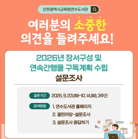 [뉴스노크=김인호 기자] 인천광역시교육청연수도서관은 9월 23일부터 3주간 ‘2026년 장서 구성 및 연속간행물 구독 계획 수립’을 위한 설문조사를 진행한다.