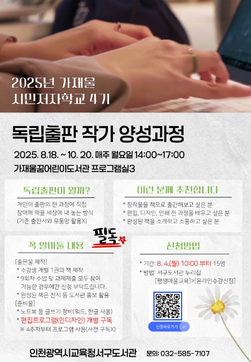 [뉴스노크=김인호 기자] 인천광역시교육청서구도서관은 가재울 시민저자학교 4기 프로그램으로 ‘읽걷쓰 독립출판 작가 양성과정’을 운영한다.