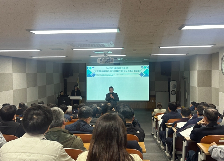 [뉴스노크=김인호 기자] 인천광역시교육청은 12일 학교 건설공사 참여자의 자발적 공정관리를 유도하고 학교시설공사 품질을 확보하기 위해 신설학교 공사관계자를 대상으로 합동협의회를 개최했다.