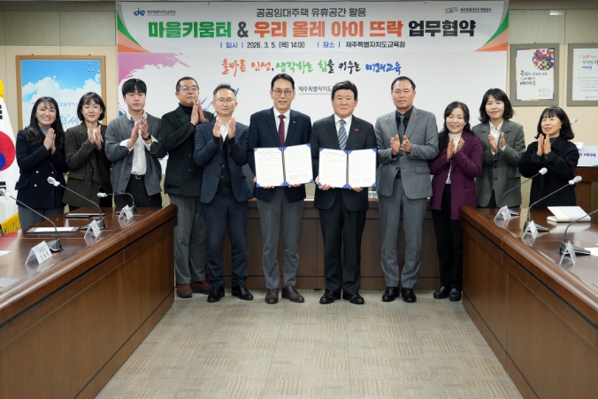 [뉴스노크=김인호 기자] 제주특별자치도교육청은 제주특별자치도개발공사와 5일 도교육청 상황실에서 공공임대주택 유휴공간을 활용한 ‘우리 올레 아이 뜨락’ 사업과 도교육청 ‘2026 마을키움터 운영’ 사업의 상호 협력을 위한 업무협약을 체결했다.