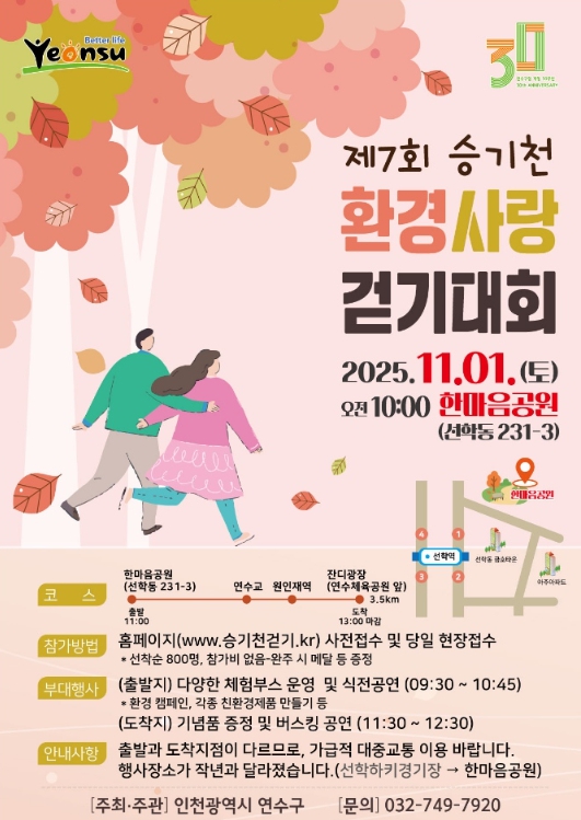 [뉴스노크=김인호 기자] 연수구는 오는 11월 1일 오전 10시 한마음공원(선학동 231-3) 및 승기천 일원에서 구민과 함께 자연 속에서 걷는 ‘제7회 승기천 환경사랑 걷기대회’를 개최한다.