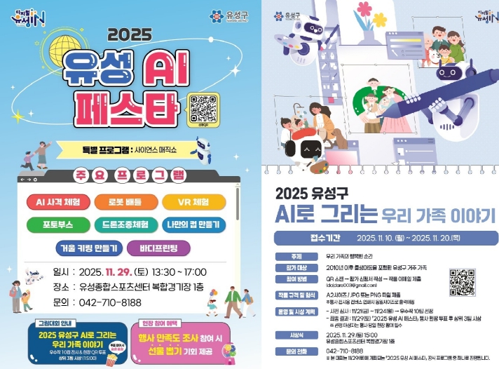 유성구는 오는 29일 유성종합스포츠센터에서 가족이 함께 즐길 수 있는 디지털 체험 축제 ‘유성 AI 페스타’를 개최한다. 참여 신청은 10일부터 유성다과상 홈페이지에서 선착순으로 가능하다.
