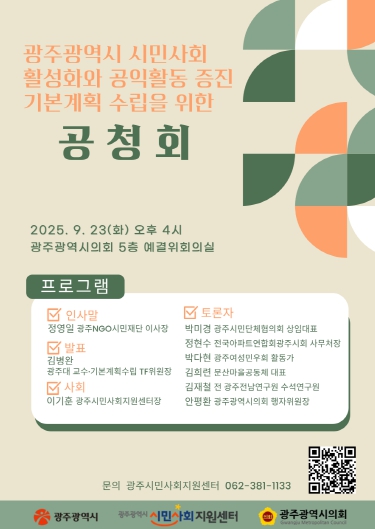 [뉴스노크=김인호 기자] 광주광역시는 23일 오후 4시 광주광역시의회 5층 예결위회의실에서 ‘광주광역시 시민사회 활성화와 공익활동 증진을 위한 기본계획(제1차, 2026~2028)’ 최종보고회 겸 공청회를 개최한다.