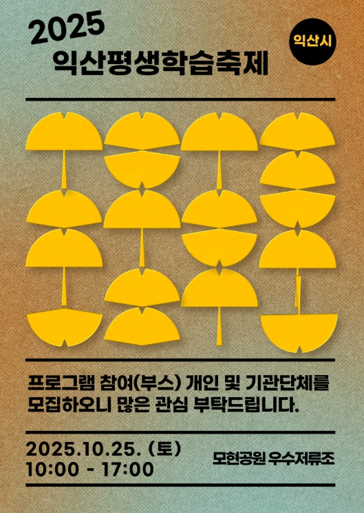 [뉴스노크=김인호 기자] 익산시가 시민과 함께 배우고 나누는 '2025 익산평생학습축제'를 빛낼 체험홍보관 부스와 무대공연팀을 모집한다고 25일 밝혔다.
