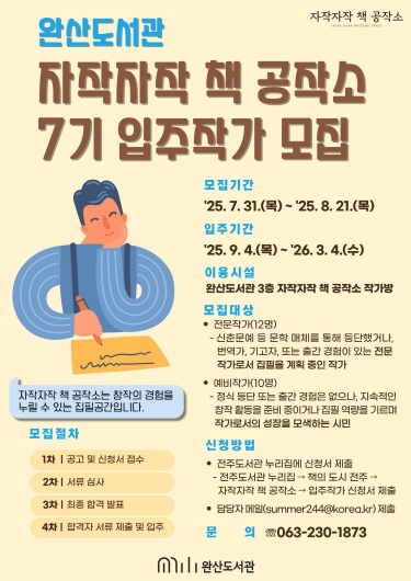전주시는 오는 8월 21일까지 시민과 작가가 함께 성장하는 창작 공간인 완산도서관 내 ‘자작자작 책 공작소’의 7기 입주작가를 공개 모집한다.