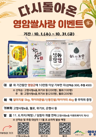 이영주 영암군 홍보전략실장은 “이번 이벤트를 통해 기부자분들께 영암 대표 쌀을 선물로 드리고, 동시에 지역 농가에도 활력을 불어 넣겠다”고 밝혔다.