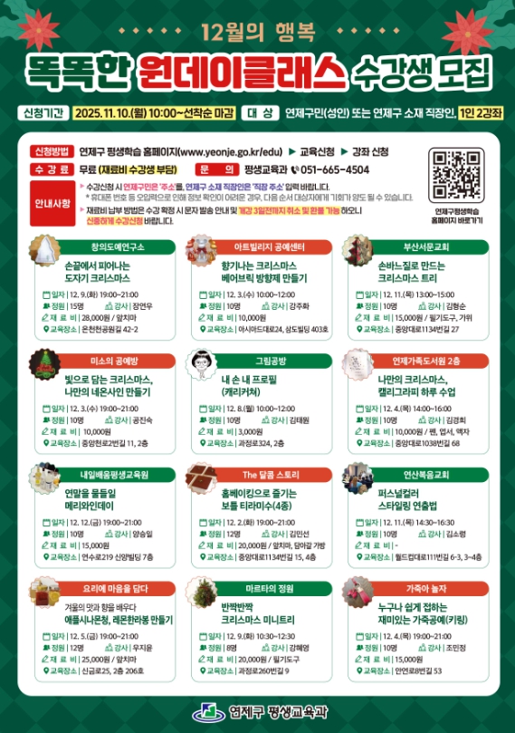 [뉴스노크=김인호 기자] 연제구는 11월 10일부터 ‘2025년 제2차 똑똑한 원데이 클래스’ 프로그램 수강생을 선착순 모집한다.